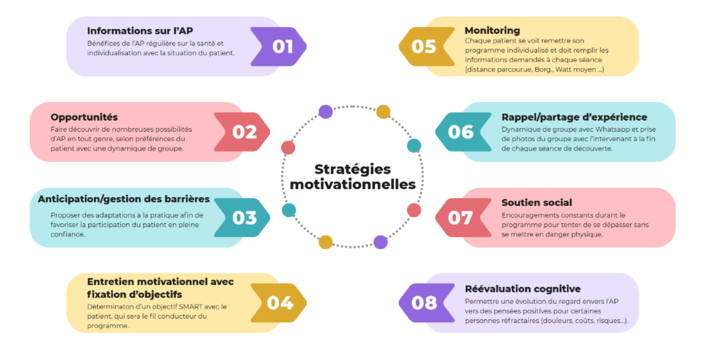 Après avoir identifié et accompagné la levée des freins à la pratique d’une activité physique et/ou sportive pour les personnes en situation de handicap qu’ils soient matériels, financiers, motivationnels, sociaux, d’accessibilité ou médicaux, les stratégies motivationnelles peuvent être déployées par l’équipe pluridisciplinaire de l’IPS.