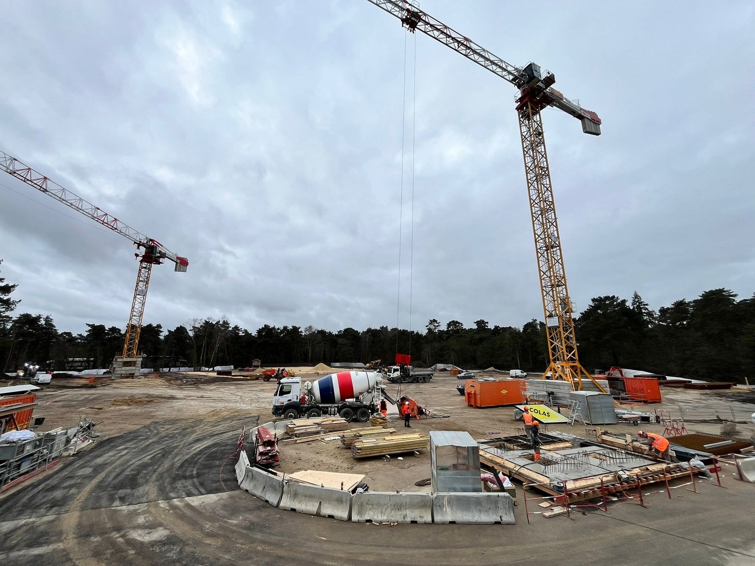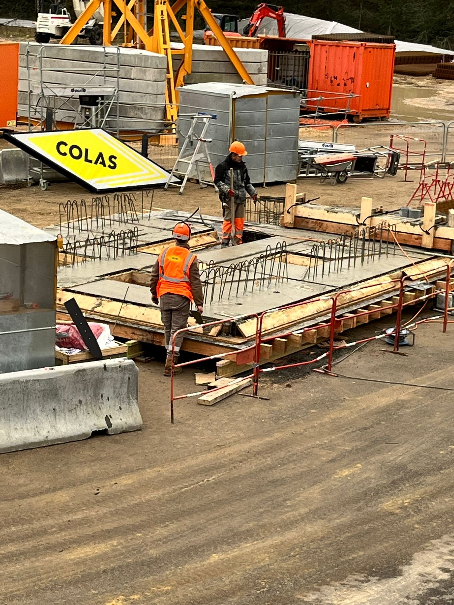 L’étape suivante (19 novembre 2025) a consisté en la réalisation des massifs de fondation destinés au montage des deux grues de chantier. La première a été installée le 17 décembre 2025 et la seconde le 8 janvier 2026.