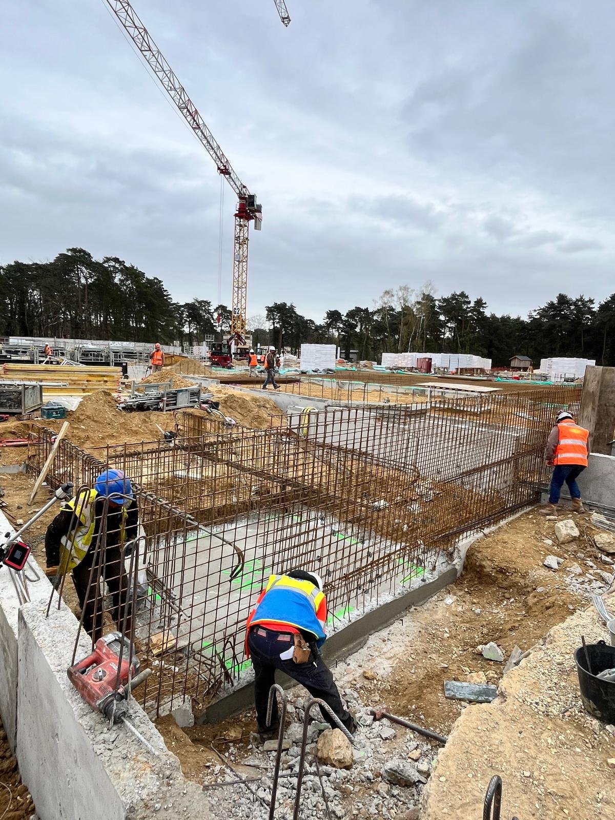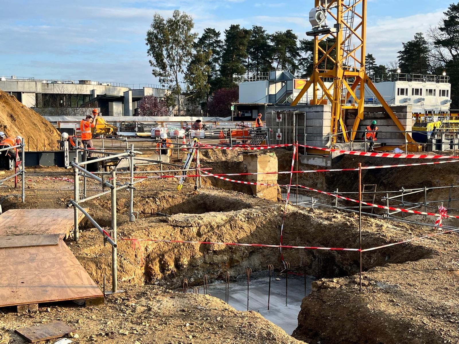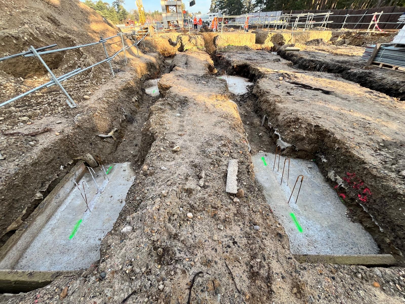 Les fondations donnent à voir la future emprise du bâtiment. Des affinements d’agencements écologiques ont complété les abords du chantier.