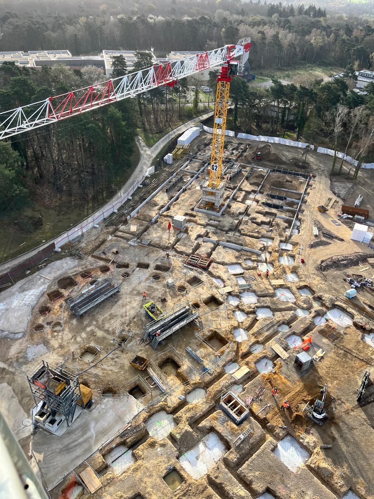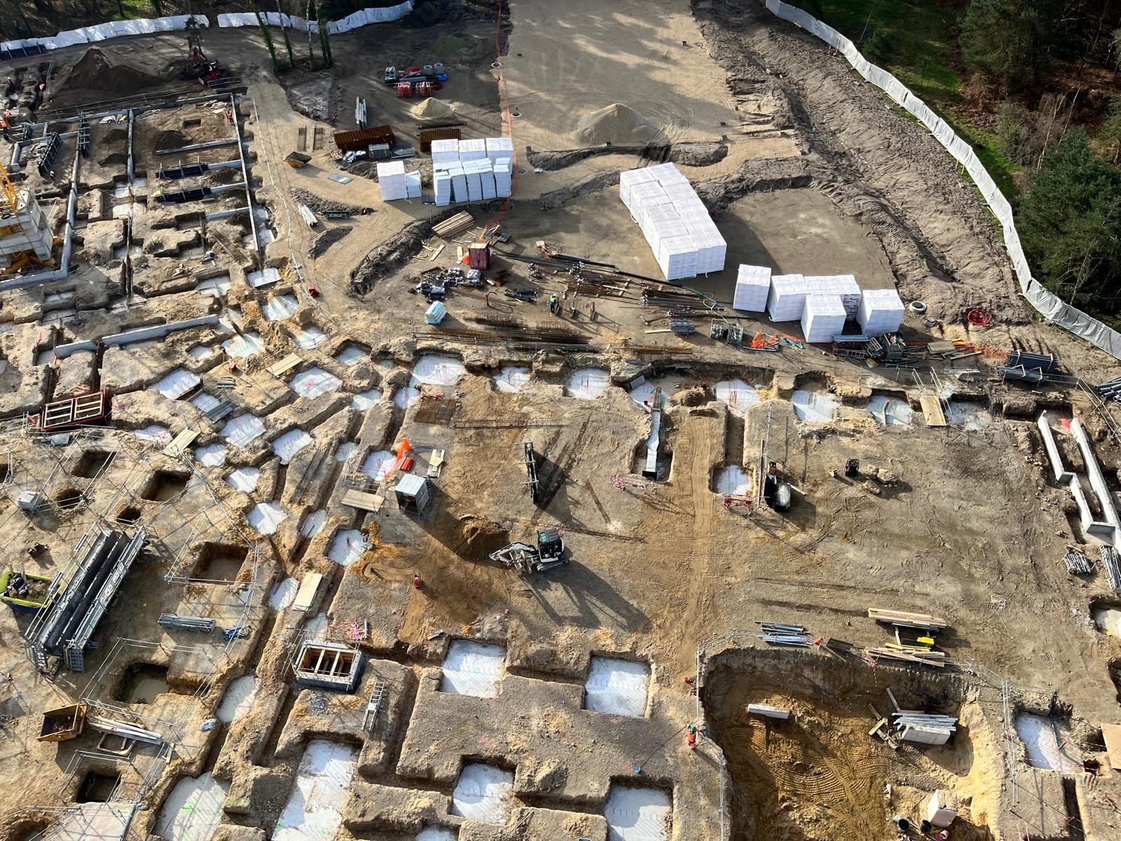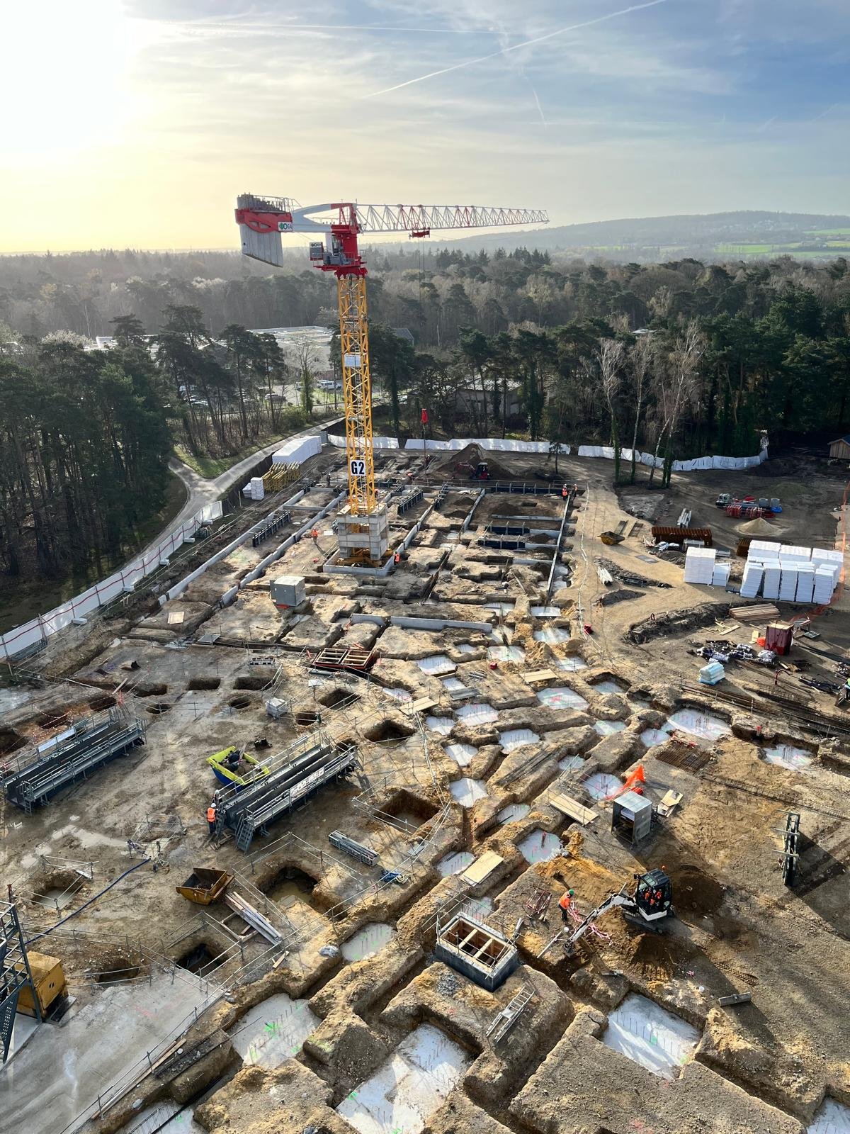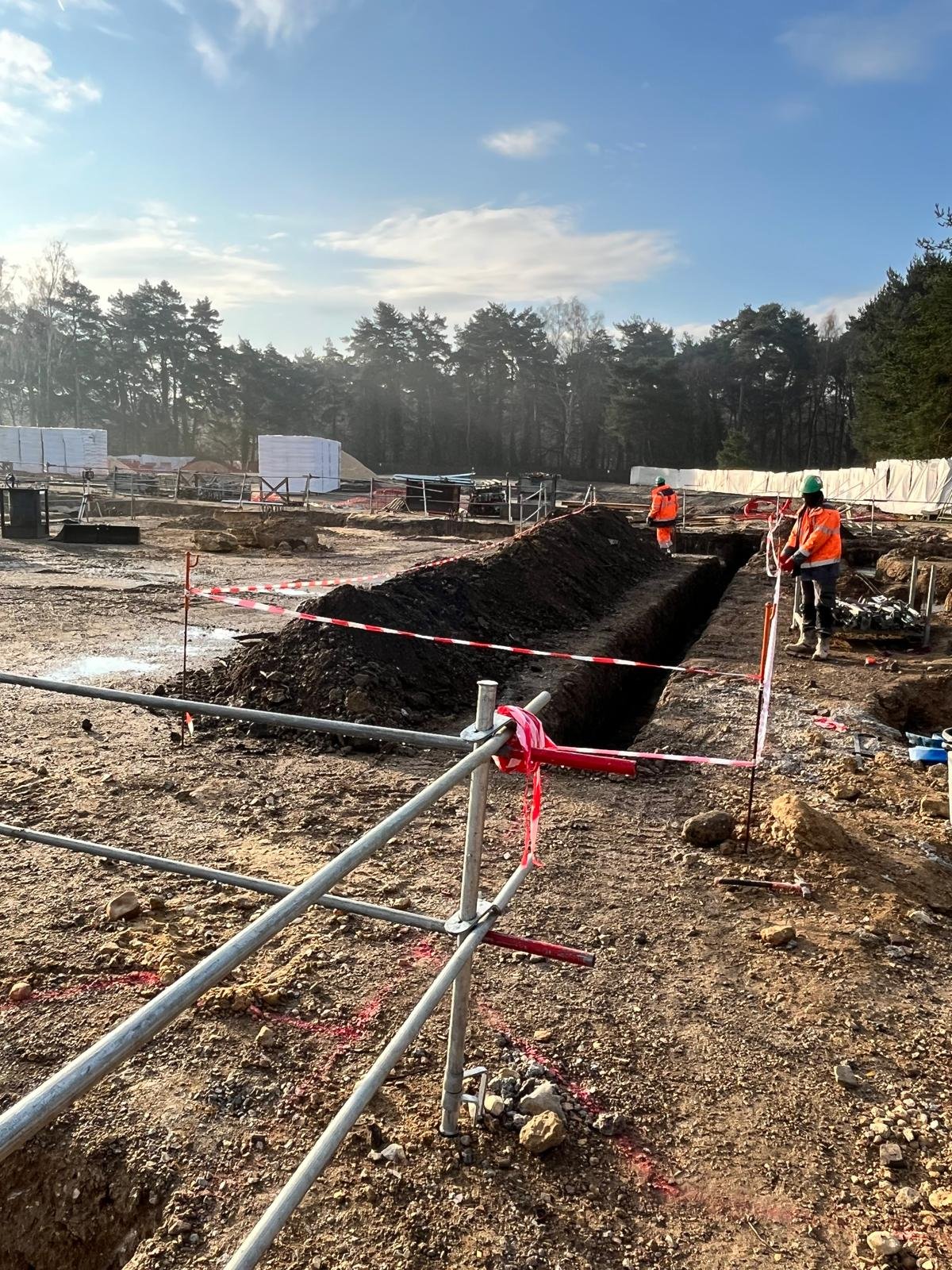 Les fondations donnent à voir la future emprise du bâtiment. Des affinements d’agencements écologiques ont complété les abords du chantier.