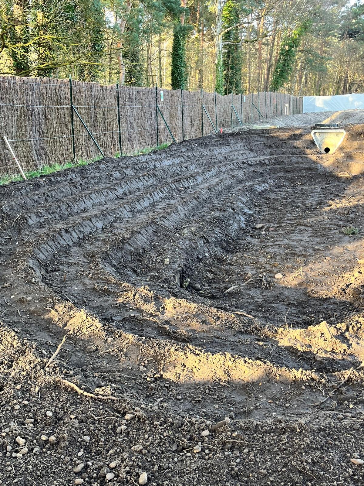 Cet aménagement s’inscrit dans les mesures environnementales du projet visant à favoriser la biodiversité locale. La mare a été façonnée par modelage du terrain naturel, avec mise en œuvre d’une couche de glaise assurant l’étanchéité du fond et permettant le maintien temporaire des eaux pluviales. Le profil a été réalisé avec des pentes douces et des variations de profondeur adaptées afin de créer différentes zones écologiques.